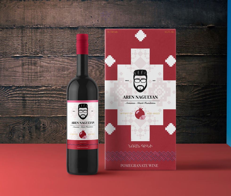 Aren Nagulyan wijn is een fictieve Armeense wijn die ik naar mij heb vernoemd. Er zijn wijnsoorten gemaakt van druiven, granaatappels en blauwe wijn. Omdat het ook een "Armeens product" is, heb ik de vormgeving ook in die stijl toegepast met Armeense ornamenten op de achtergrond. Elk soort wijn heeft per variant een onderscheiding in kleur en icoon.